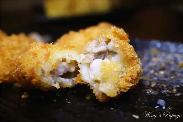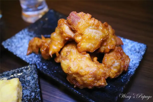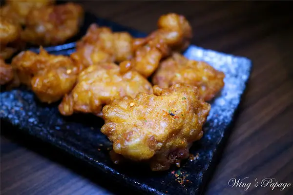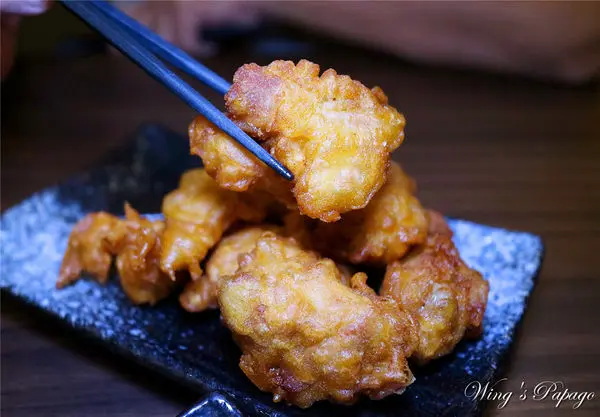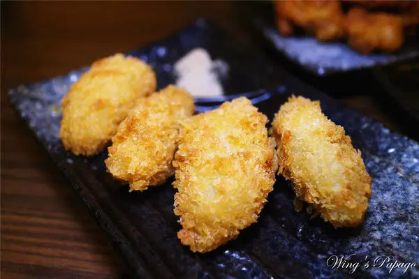 日本進口的海洋炸牡蠣一份有三顆,飽滿的牡蠣裹著金黃酥脆麵衣酥炸,附上椒鹽粉。