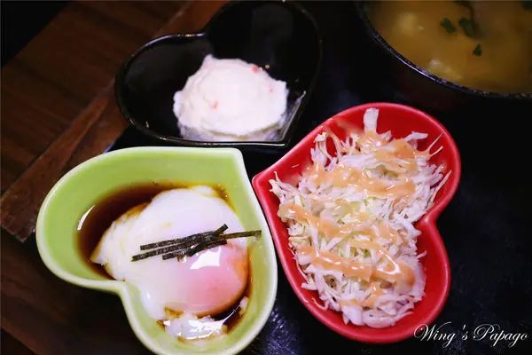 原本的主餐就有附可續的高麗菜絲及味增湯,薯泥及溫泉蛋則是加價升級成套餐的內容。