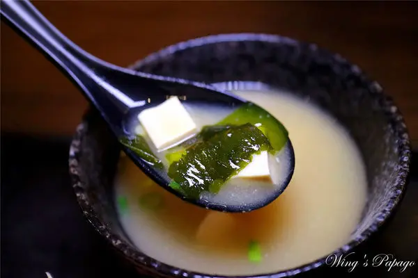非基因改造的味噌湯,內有大量海帶芽與嫩豆腐,
