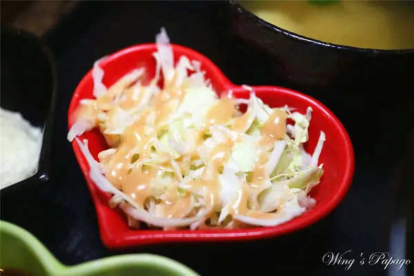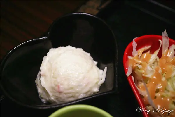 纏綿馬鈴薯沙拉細緻綿密,入口即化;高麗菜絲淋的是千島醬,爽脆順口。