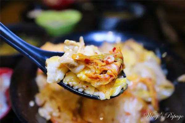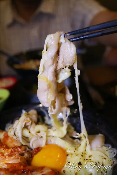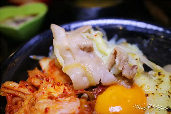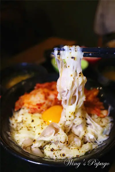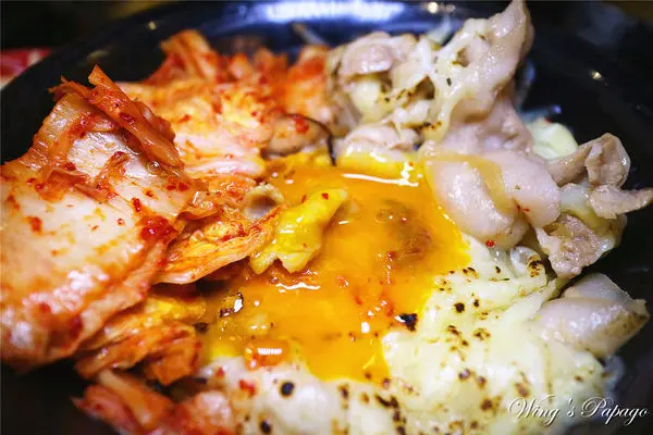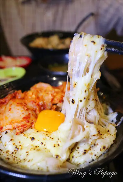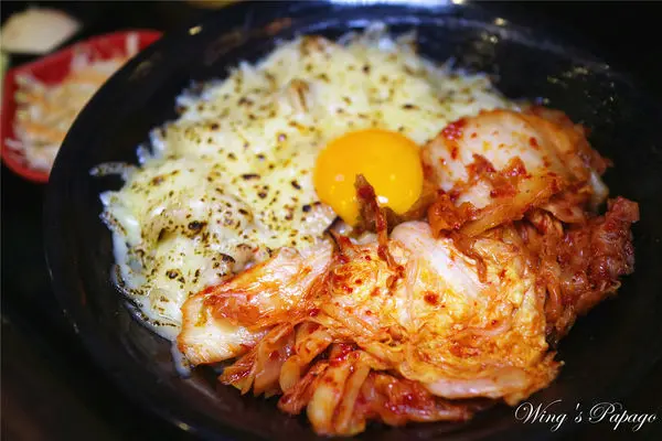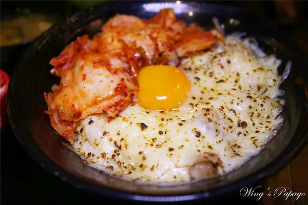 每一口都可以嚐到包覆鹹香起司的嫩口豬五花肉片,搭配大量爽脆辣勁的韓式泡菜及滑順蛋黃,