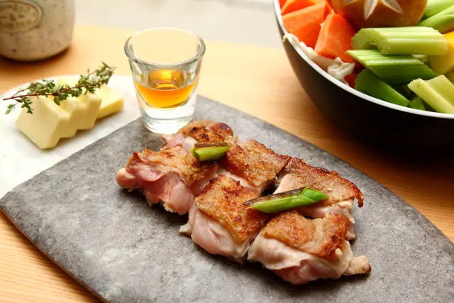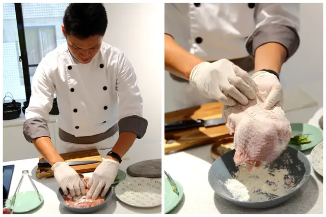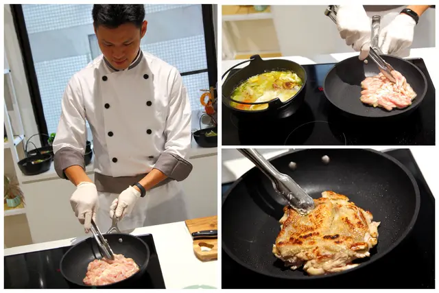有了一鍋鮮甜香醇的雞湯那該怎麼作變化呢?!主廚想到用白蘭地來賦予雞湯新生命,主廚先處理主食材,先將去骨雞腿肉抹上麵粉,放上平底鍋煎至6~7 分熟,雞皮面朝下先煎,靠著雞皮的雞油讓雞皮煎酥煎熟,接著翻面用鍋內雞皮的由來將雞肉煎至想要的熟度