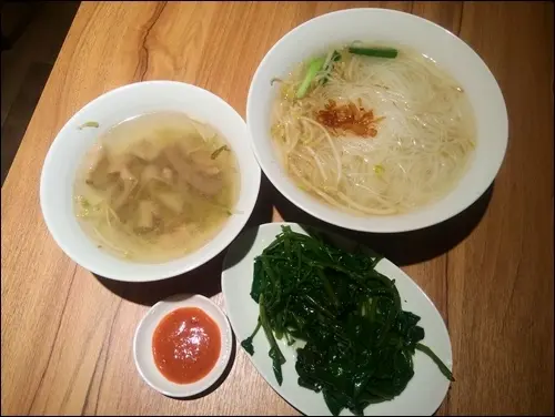 簡單點了米粉、鵝腸湯和燙青菜,拿些甜辣醬來沾鵝腸。