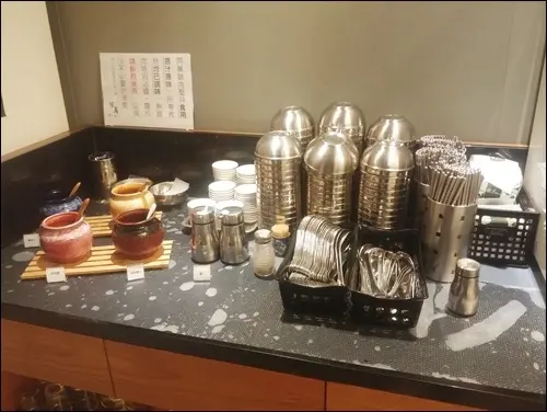 點小菜切盤可以沾的調味醬及餐具區。阿萬鵝肉已全面使用環保餐具,不銹鋼的碗筷在燈光照射下顯得啵亮。