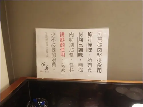 阿萬鵝肉特別提醒顧客他們的鵝肉都已調味過,不須特別取用沾醬,所以口味比較重的人自己斟酌,以免造成不必要的浪費。