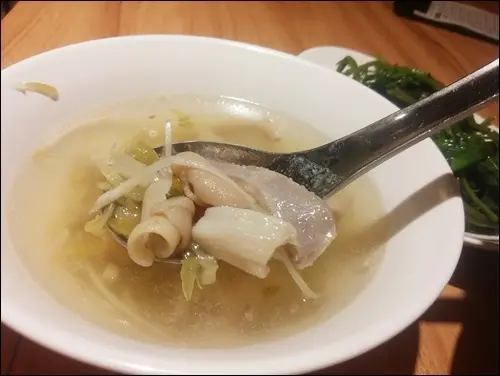 鵝腸湯內還有許多酸菜,鵝腸帶有微微的酸香和適當的脆口,還可以沾上醬料來豐富口慾。