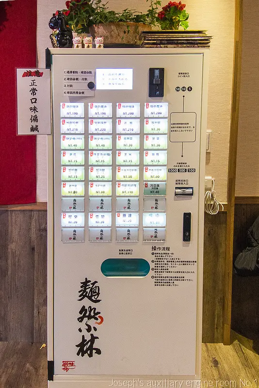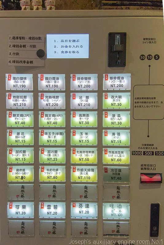 售票機。店員不經手金錢,確定好菜單後在此購票。先按鈕後再投錢,比日本一些拉麵售票機聰明一些。