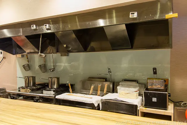 廚房很乾淨,不過也剛營業不久。最左邊大鋼桶應該是熬湯頭用的,火爐上的是加熱湯頭的小鋼鍋。煮麵是用麵簍,起麵時只甩一下就掛起來滴水。最右邊是炸雞塊的小油鍋。