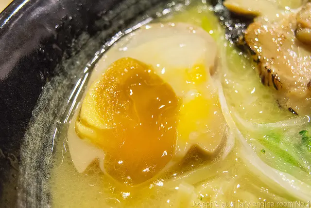 半熟蛋嚇到麻糬,因為好有味道。蛋的鹹味比湯頭還重耶,而且軟嫩好吃。蛋旁邊白色的是未去味的蔥絲。