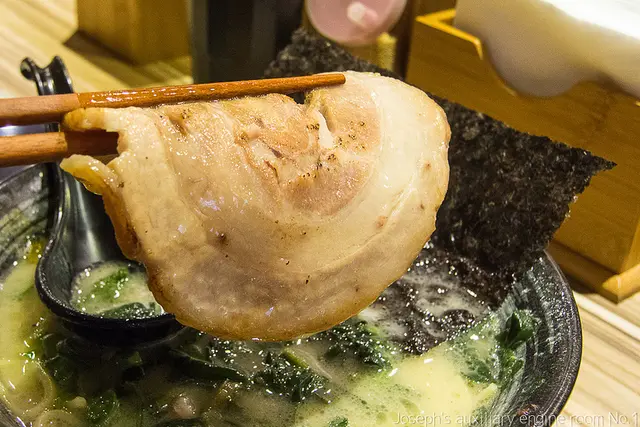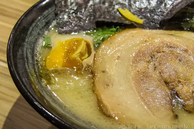 五花肉捲成的叉燒,軟度一般。但是味道也還好,沒有特別的地方。豚骨鹽味的湯也不算濃,但是味道有出來。喝的出來豚骨的味道,與鹽味搭配起來不膩。至於配菜麻糬就看不出來了,不像是日式拉麵常用的配菜。應該也是台灣常見的菜葉吧?