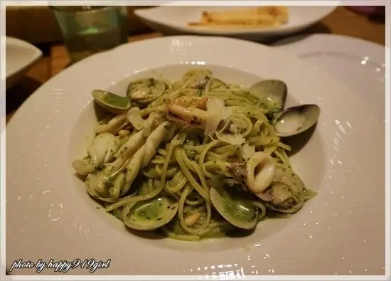 有著豐富配料的青醬中卷蛤蠣義大利麵(貪吃價$255)
