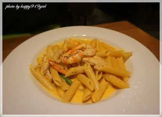 好像加了糖般充滿南瓜鮮甜滋味的南瓜鮮蝦雞肉筆管麵(貪吃價$210)