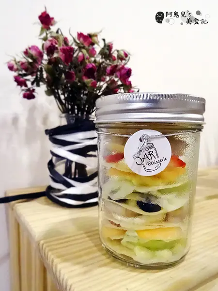 把水果千層蛋糕搖身一變成為裝在玻璃瓶中的甜點,看起來更夢幻