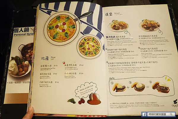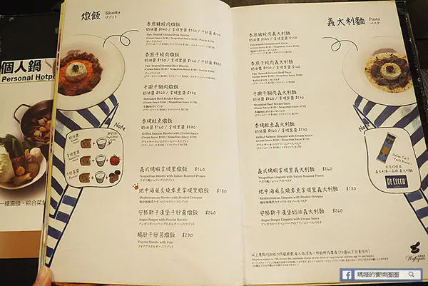 其它的排餐、義大利麵和燉飯、披薩選擇多,價格也都很親民,店內餐點皆加收10%服務費,每人低消為一杯飲料或濃湯(10歲以下兒童除外)
