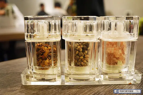 每桌皆附基本的玫瑰鹽、胡椒和辣椒可任意調味