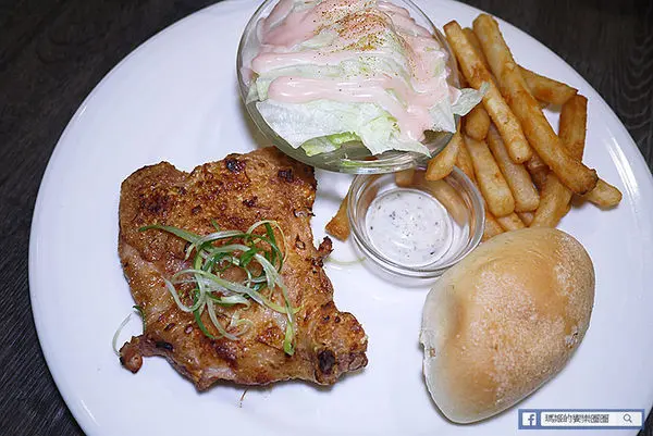 「香料烤雞腿」229元,同條附有松露薯條、生菜沙拉和一個奶酥餐包