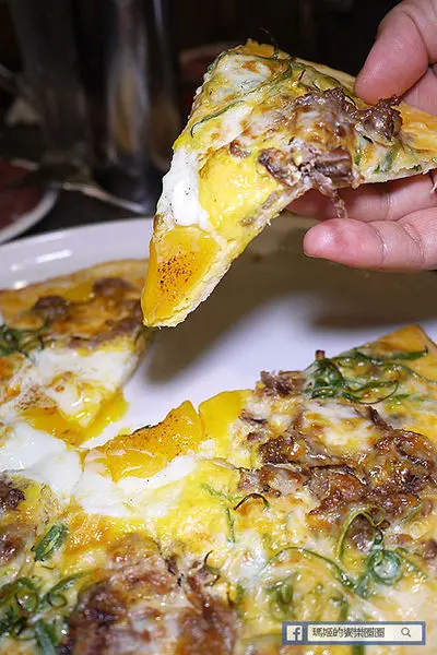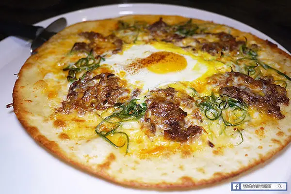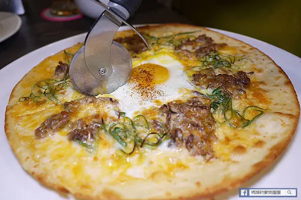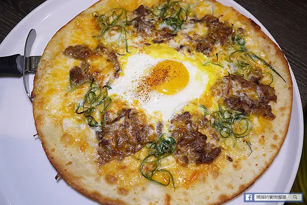 「手撕牛胸肉比薩」150元,中間的蛋可選全熟或半熟蛋,旁邊圍了一圈手撕牛胸肉,加上大量蒽絲和起司,尺寸是十吋大小,以價格來說相當划算。