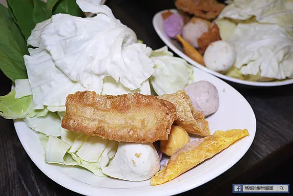 一人一份的基本菜盤,裡面有油條、蛋餃、貢丸、山藥球、青江菜和高麗菜,份量來說一個人剛剛好。
