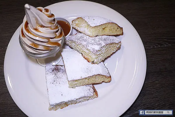 厚鬆餅吃起來不是特別鬆軟的,反而多了點紮實感像蛋糕,建議可以搭配霜淇淋或牛奶糖醬,增加點濕潤度才不會太乾。