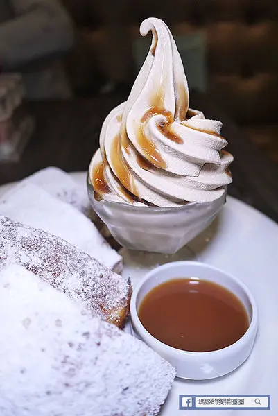 茶香霜淇淋上也淋了牛奶糖醬汁,但吃起來不會很甜,愛吃甜食的小妞加了牛奶糖醬後覺得甜度更好,吃得更起勁,她說主餐雖然吃得很飽,但還是要留一點空間給甜點XDDD