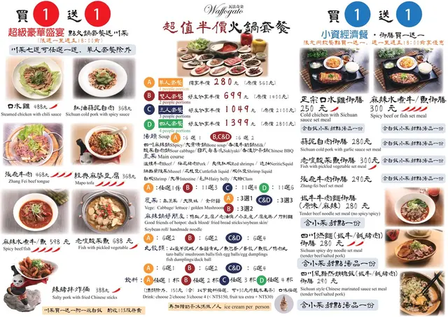 來看看瓦法奇朵複合式餐廳的菜單吧,我只能用驚訝來形容,義大利麵、牛肉麵、個人鍋物等約莫價位在200元左右,經典四川麻辣火鍋直接是打到骨折的半價優惠,最狂的還是四川料理御膳,平日18:00前限定同餐點買一送一,川菜料理也是買一送一!真的超誇張的啦!