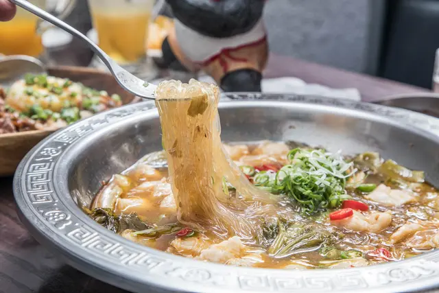 老罈酸菜魚使用的是無刺的多利魚,也就是一般俗稱的國宴魚,肉質軟嫩細緻,也很容易吸收醬汁,口感微辣酸香,多利魚片香嫩爽口,魚湯鮮甜不膩,裡面還加了冬粉,充分吸收了魚湯的精華,超好吃!