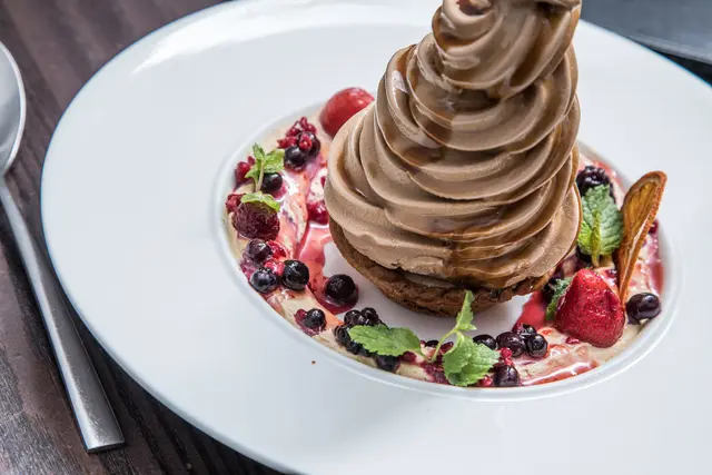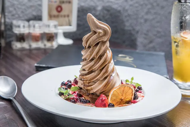 奶茶聖代是用自製的奶茶冰淇淋,口感綿柔滑順,奶茶風味也很特殊,加上酸甜莓果跟卡士達醬,口感相當豐富,份量也是超巨大,一份聖代兩個人吃還有點多呢!
