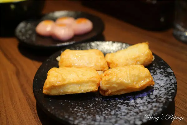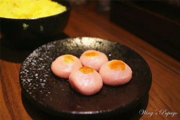 明太子球及一口花枝捲Q彈有勁,嚐得到鹹香的明太子顆粒及新鮮花枝條。