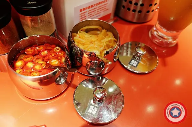 桌上的調味料醋泡辣椒 爽脆洋蔥是我很喜歡的配菜