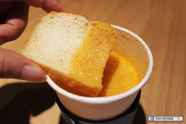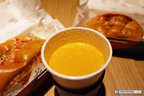 「龍蝦濃湯」120元,無論內用或外帶都是用速食店的中紙杯裝,大約七分滿,裡面的湯底都是用龍蝦殼和蝦肉泥去熬煮出來的,帶有新鮮的龍蝦鮮味和奶味,不過就二人分食不太滿足!