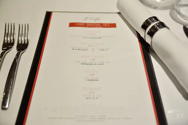B-Cape Steakhouse 黑角牛排館菜單在官網也可看得到,此次是因愛評網的活動來吃美國頂級肋眼牛排12oz主廚特製套餐,價格是$1980+10%有開胃菜、湯或沙拉、美國頂級肋眼牛排 12 盎司、甜點與飲料,如果是每週五11:30~14:00,兩人同行,則一人可免費。