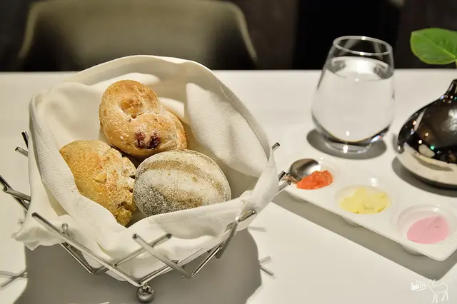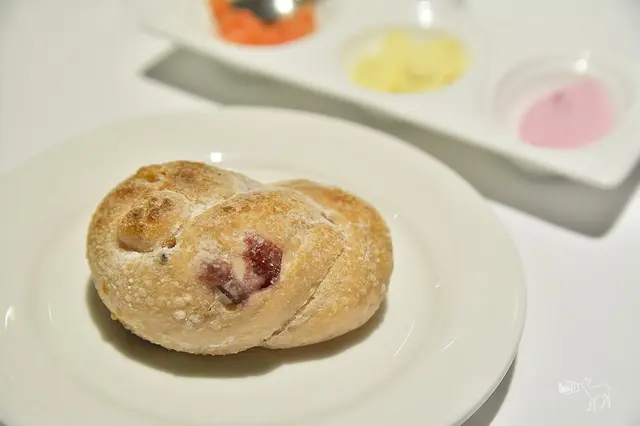 搭配麵包的醬料有自製甜鹹帶點甜菜根起士醬、奶油與番茄沙沙醬,甜菜根起士醬滿特別的,不過容易搶蓋住麵包的味道;奶油則是較為一般常見的奶油,沒特別性;番茄沙沙醬滋味較過於平淡,以這價位的抹醬來說層次跟細膩程度有進步空間。