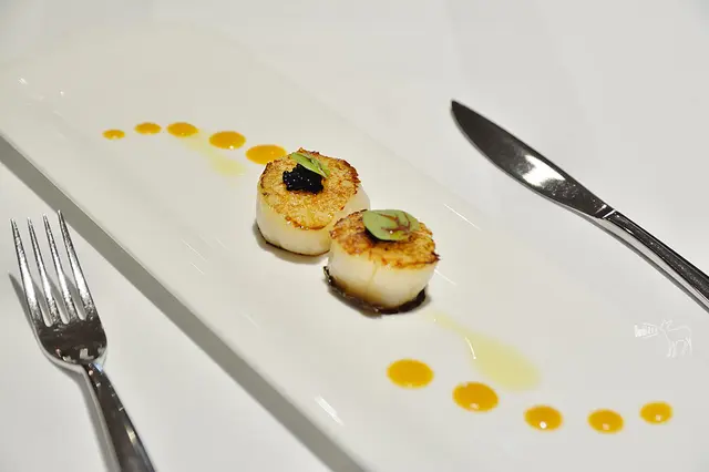 前菜是香煎干貝佐番茄鯷魚醬汁