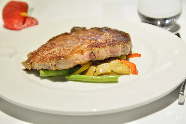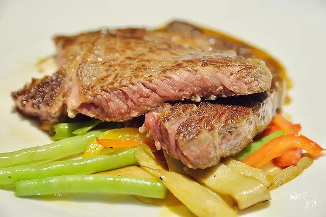 牛肉的份量真的很大,底下襯著的是炒四季豆、甜椒、杏鮑菇,不過有點油。牛排熟度我選擇的是五分熟,牛排柔軟,味道還不錯,可吃的到牛肉的甜香味,一旁的紅酒醬很香,我滿喜歡的。