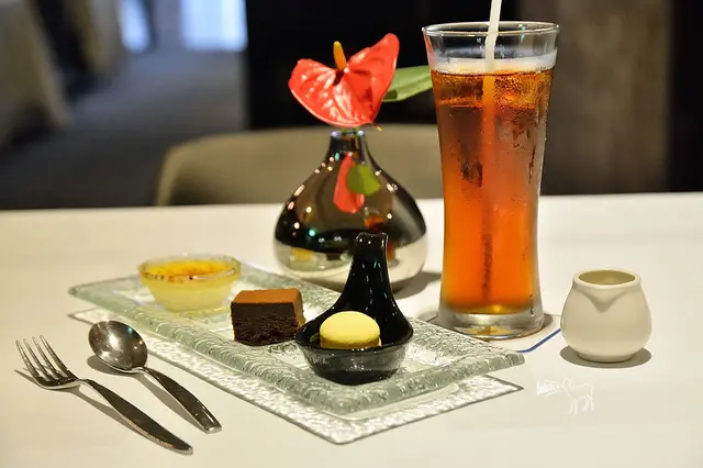 餐後的甜點是檸檬馬卡龍、烤布蕾、巧克力布朗尼,飲料可選咖啡或茶,整體就較為一般,馬卡龍的外型像是小漢堡或是台式小西點的圓弧度,反倒不像馬卡龍,口感也較硬。