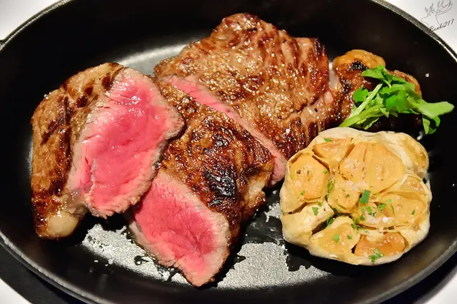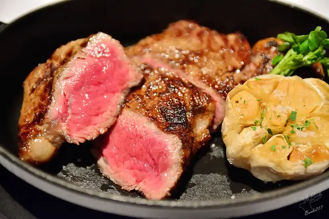 和上方的美國頂級肋眼牛排同為3-5分熟,肉質是軟嫩中帶些咬勁口感,而且甜美、飽含肉汁,即便是平日我不會去吃的紐約客部位,卻讓我覺得好吃呢!