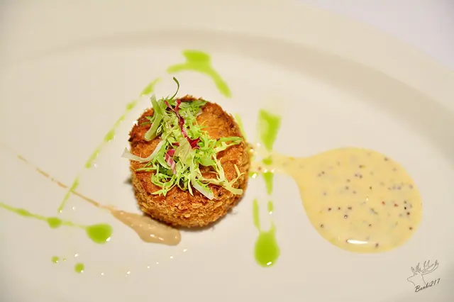 以日式可樂餅為概念,外皮酥脆,裡頭還有一些蟹腳,吃起來蟹味香甜,一旁可搭配山葵醬汁或是芥末籽美乃滋醬。