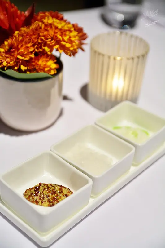 可搭配牛排的沾醬,從左至右為山葵醬(這製作的非常細綿,有山葵香卻不嗆)、鹽之花、芥末籽醬,可依照個人喜好搭配,牛排本身已有鹹度調味。