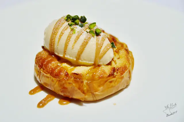 甜點當日有舒芙蕾、巧克力布朗尼、蘋果塔、綜合冰淇淋、起司蛋糕,此為家人點選的蘋果塔,上方則為冰淇淋與開心果碎。
