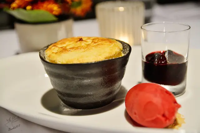 舒芙蕾甜點和我之前所吃過的外型略有些不一樣,表面微焦黃感倒像是煎蛋的色澤。不過口感仍舊軟綿,一旁附莓果醬與雪酪,我想應是覆盆子口味的吧,吃起來酸甜,整體而言還不錯。