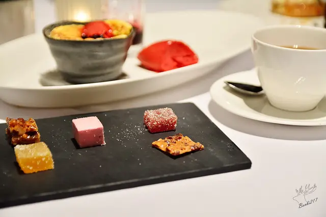 小點可搭配飲品用,有法式軟糖、脆片與焦糖核果,除了中間粉紅色的口感我個人不是很喜歡外,另外兩顆法式軟糖口感與滋味不錯,一個是莓果感,另一個則有熱帶水果感,焦糖核果的焦糖醬很香。