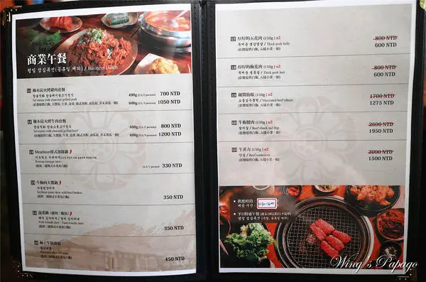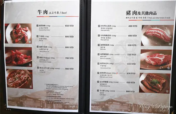 Menu,燒烤食材提供各式牛肉、豬肉及其他肉品,