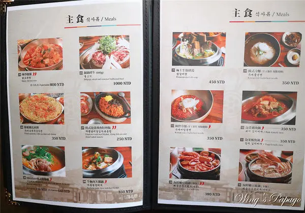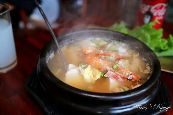 主食有鮮蝦櫛瓜煎餅、部隊鍋、大醬鍋、冷麵、豆腐鍋等,