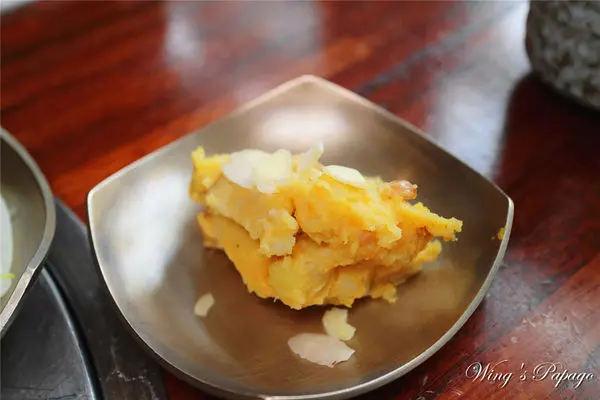 蘋果南瓜泥,混和南瓜、地瓜及馬鈴薯泥,再加入蘋果片、碎花生及杏仁片調味,