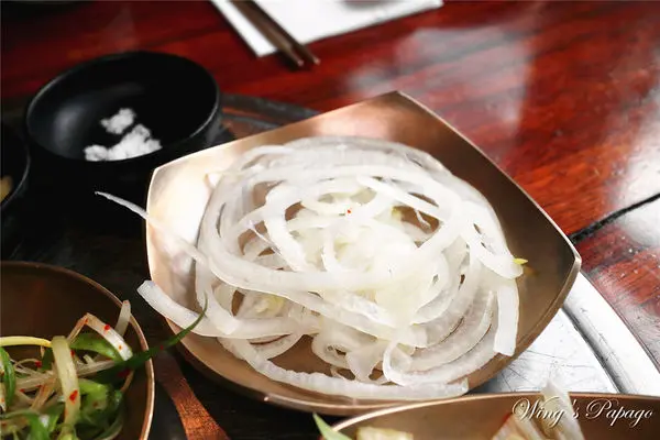 辣蔥絲、洋蔥可與烤肉一同食用,也可包覆在生菜內增加口感。