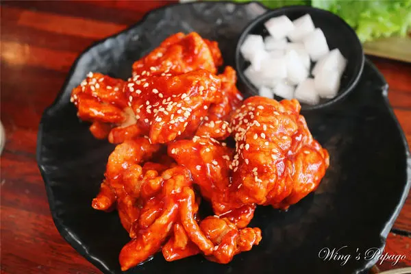 包覆特調韓式醬料的果香辣甜炸雞色澤鮮橘誘人,嚐來酥嫩可口,富有肉汁香氣,
