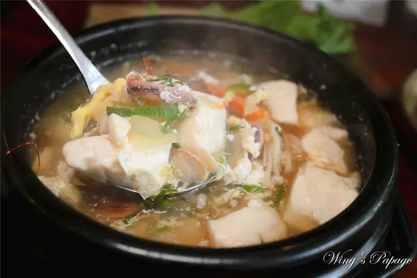 豆腐鍋送上桌時還熱騰騰的冒著煙,海鮮豆腐鍋有原味及辣味,我們選了原味。