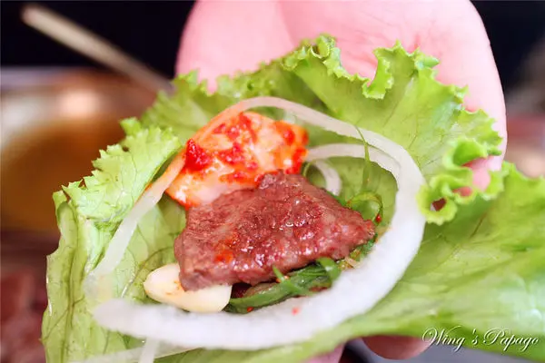 包了洋蔥、泡菜、蒜片、辣蔥絲,牛板腱沾點韓式辣醬,捲起來整個入口,滋味真是美妙啊!