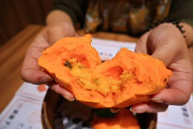 掰開黑嚕嚕著神秘面紗的叉燒包,內餡是鮮明亮眼可口的深橘色,叉燒甜滋滋帶鹹的滋味好喜歡,不過餡料在多一點會更愛。