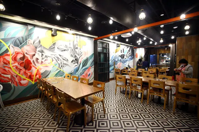 Jamie’s Italian Taiwan還有設置一個大包廂的空間,Jamie’s Italian在旗下每一間餐廳都會在一面牆上描繪屬於當地人文風情的壁畫,背景牆上是香港藝術家Caratoes為Jamie’s Italian Taiwan所畫的壁畫,主題是媽祖在守護台灣漁船,象徵守護著台灣的意境